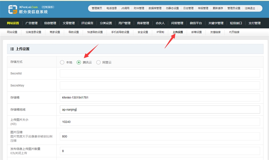 創(chuàng)建好后,把存儲(chǔ)桶名和地域填到自己網(wǎng)站后臺(tái)【上傳設(shè)置】中,存儲(chǔ)方式選擇騰訊云,如圖