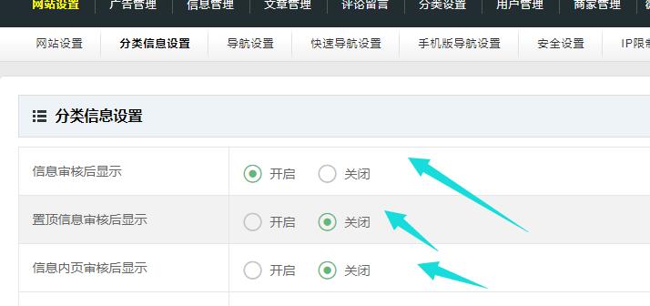 在后臺(tái) - 網(wǎng)站設(shè)置 - 分類信息設(shè)置 把審核后顯示關(guān)閉就可以了