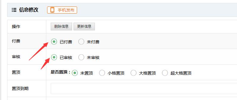 但框分類為一些新站考慮,信息量少,想讓一些未付費(fèi)的信息也顯示出來(lái),所以未付費(fèi)的信息在網(wǎng)站后臺(tái)還是可以看到的,在信息管理中,修改這條信息,把付費(fèi)和審核都打鉤,這樣這條信息就正常顯示了