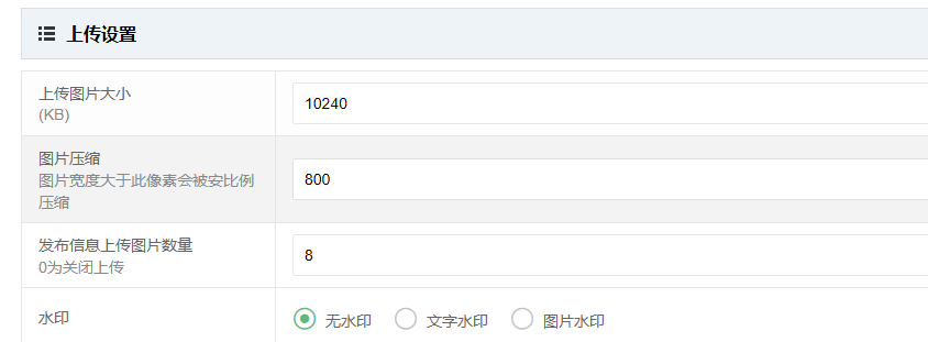 圖片壓縮是設(shè)置上傳后圖片壓縮到多大,如設(shè)置800,就是將圖片壓縮到800像素寬,高度自動(dòng)按比例縮放