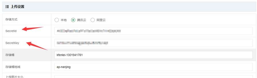 創(chuàng)建好后,把存儲桶名和地域填到自己網(wǎng)站后臺【上傳設(shè)置】中,存儲方式選擇騰訊云,如圖