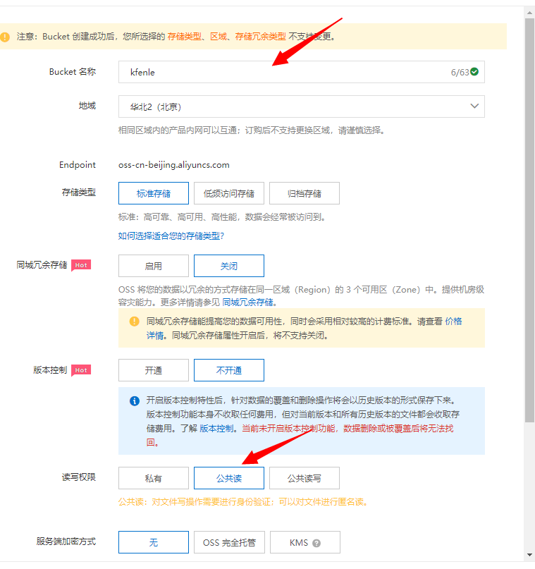 填寫【Bucket名稱】,讀寫權(quán)限設(shè)置為【公共讀】,其它默認(rèn)即可。