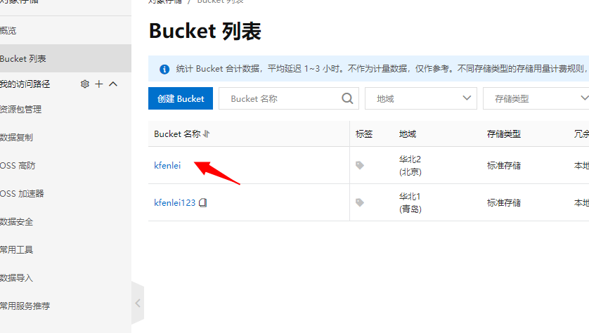 在阿里云Bucket列表中,可以看到存儲(chǔ)桶名