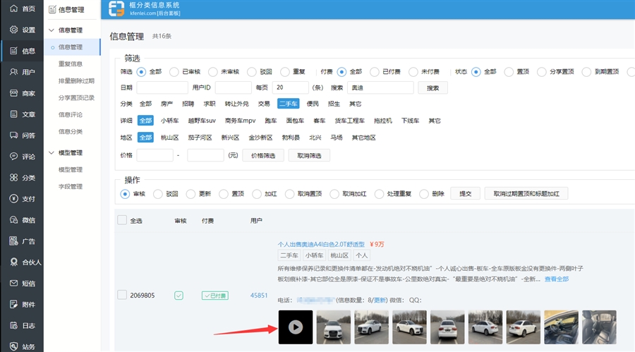 在分類 - 信息分類中,找到要開啟的分類,點擊修改,鉤選【開啟視頻上傳】