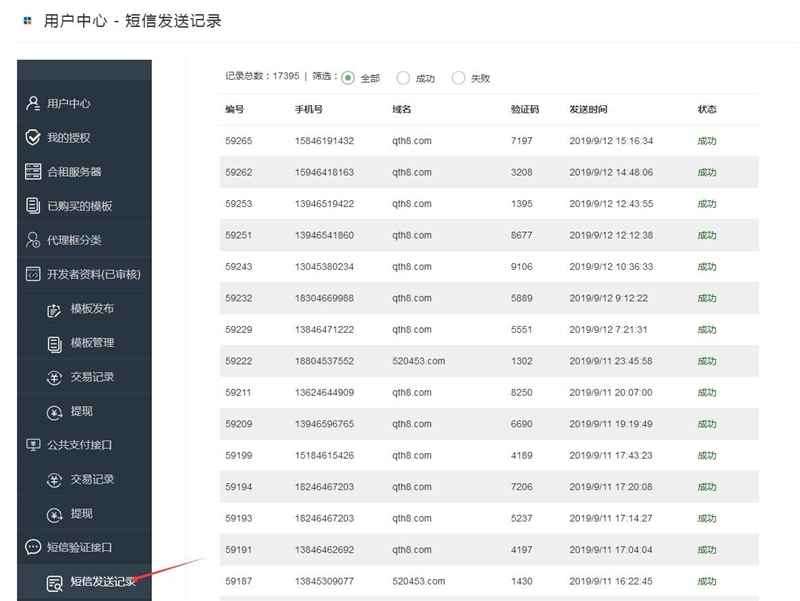 在您網(wǎng)站的后臺(tái)也可以看到短信的發(fā)送記錄