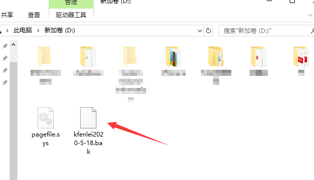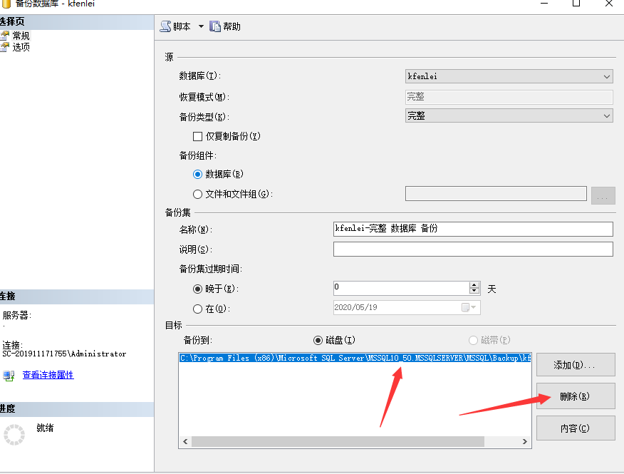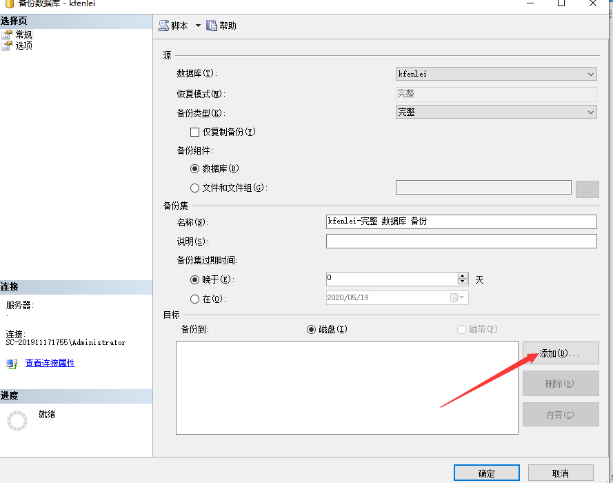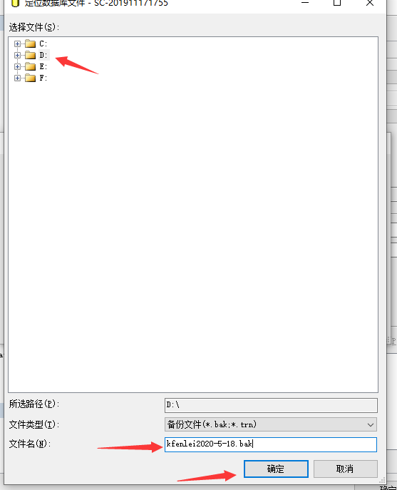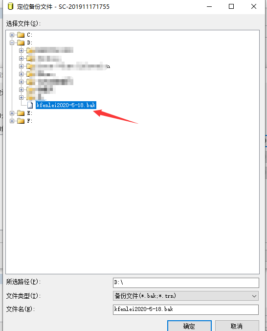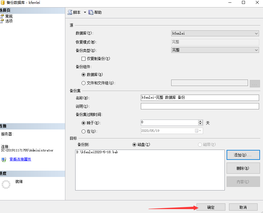 我們這里選擇D盤,備份文件名為kfenlei2020-5-18.bak