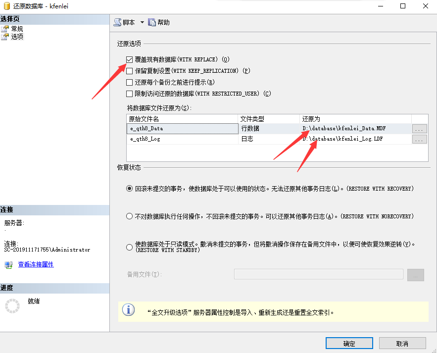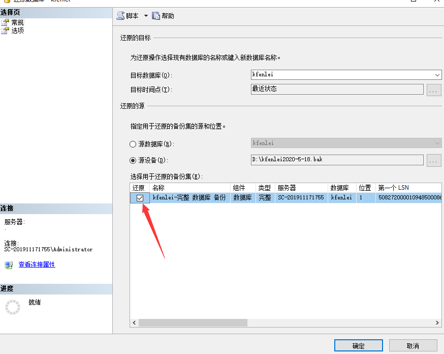 默認(rèn)數(shù)據(jù)庫選擇剛才還原的數(shù)據(jù)庫