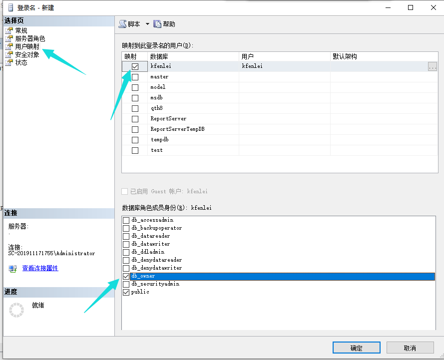 數(shù)據(jù)庫角色成員身份,鉤選db_owner和public