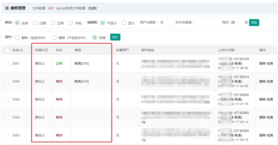上傳文件,在后臺(tái)附件管理中刪除文件,后臺(tái)列表不下去, 一直都在、