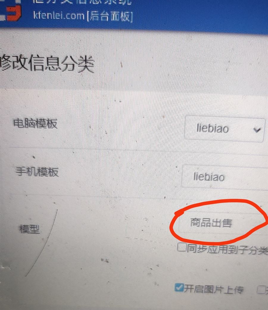 2:管理后臺(tái),修改分類,模型選擇:商品出售,電腦與手機(jī)模板都是以前的liebiao,因?yàn)槿绻沂掷锬0甯某蓋apshangpinchushou的話,內(nèi)容詳情頁(yè)就打不開(kāi),只顯示目錄地址,看圖